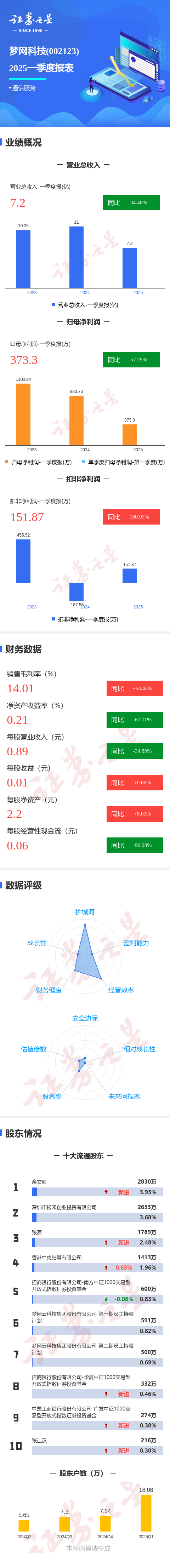 证券之星消息,梦网科技2025年一季报显示,公司主营收入7.21亿元,同比下降34.49%;归母净利润373.31万元,同比下降57.76%;扣非净利润151.88万元,同比上升180.98%;负债率52.44%,投资收益-113.15万元,财务费用797.67万元,毛利率14.01%。