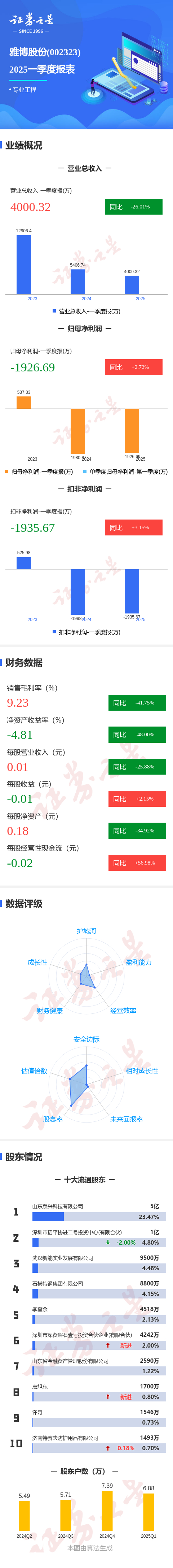 证券之星消息,雅博股份2025年一季报显示,公司主营收入4000.33万元,同比下降26.01%;归母净利润-1926.7万元,同比上升2.73%;扣非净利润-1935.67万元,同比上升3.15%;负债率60.95%,投资收益-168.68万元,财务费用512.46万元,毛利率9.23%。