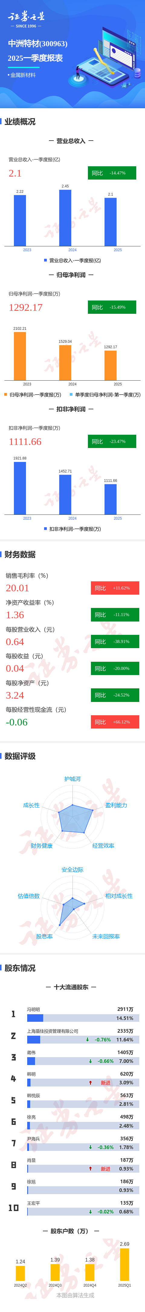 证券之星消息,中洲特材2025年一季报显示,公司主营收入2.1亿元,同比下降14.48%;归母净利润1292.18万元,同比下降15.49%;扣非净利润1111.66万元,同比下降23.48%;负债率40.28%,财务费用94.7万元,毛利率20.01%。