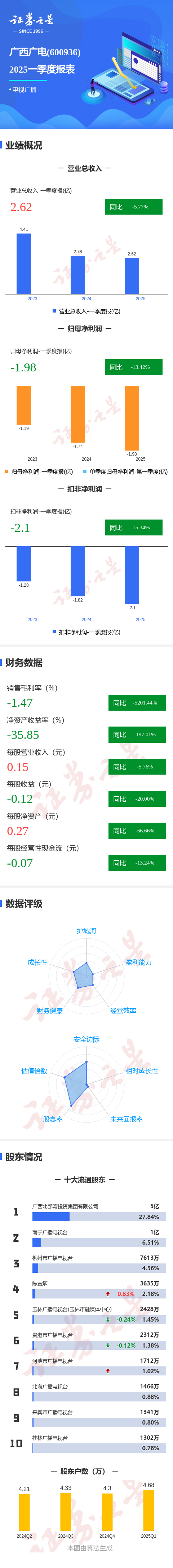 证券之星消息,广西广电2025年一季报显示,公司主营收入2.62亿元,同比下降5.78%;归母净利润-1.98亿元,同比下降13.43%;扣非净利润-2.1亿元,同比下降15.34%;负债率93.88%,投资收益-379.04万元,财务费用4137.97万元,毛利率-1.47%。