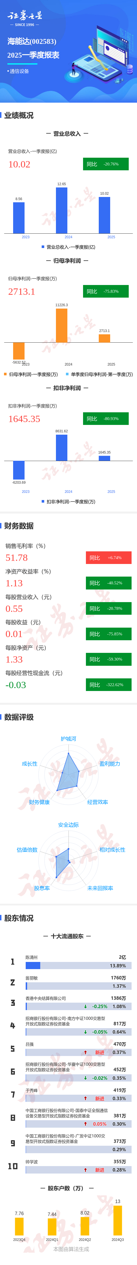 证券之星消息,海能达2025年一季报显示,公司主营收入10.03亿元,同比下降20.76%;归母净利润2713.11万元,同比下降75.83%;扣非净利润1645.36万元,同比下降80.94%;负债率77.54%,投资收益3.69万元,财务费用-64.96万元,毛利率51.78%。