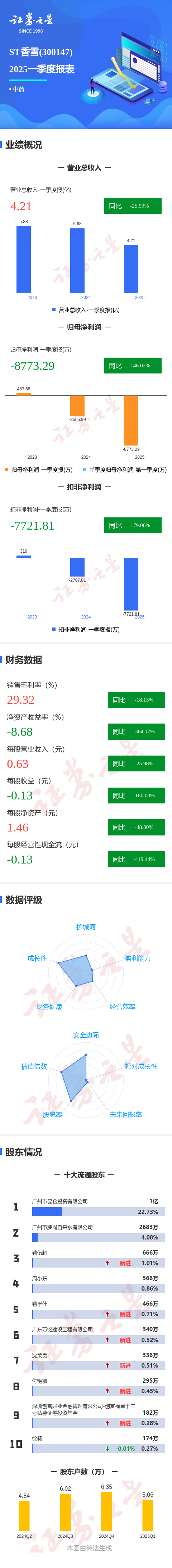 证券之星消息,ST香雪2025年一季报显示,公司主营收入4.21亿元,同比下降25.99%;归母净利润-8773.29万元,同比下降146.03%;扣非净利润-7721.82万元,同比下降179.07%;负债率81.75%,投资收益77.37万元,财务费用5556.84万元,毛利率29.32%。