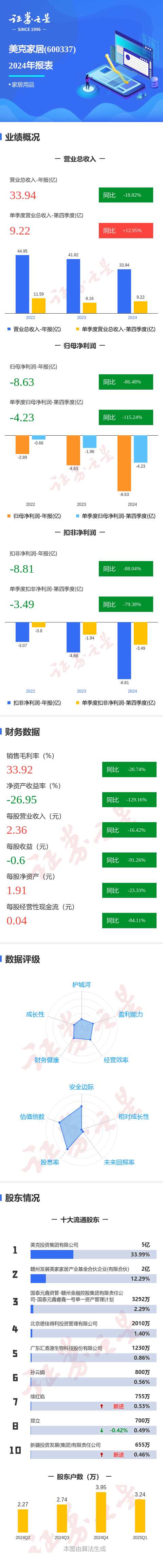 证券之星消息,美克家居2024年年报显示,公司主营收入33.95亿元,同比下降18.83%;归母净利润-8.64亿元,同比下降86.48%;扣非净利润-8.81亿元,同比下降88.04%;其中2024年第四季度,公司单季度主营收入9.22亿元,同比上升12.96%;单季度归母净利润-4.23亿元,同比下降115.24%;单季度扣非净利润-3.5亿元,同比下降79.39%;负债率65.25%,投资收益8428.5万元,财务费用1.79亿元,毛利率33.92%。