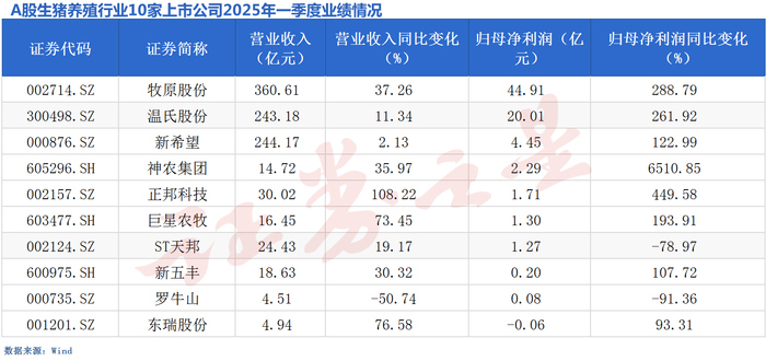 Wind数据显示,申万生猪养殖行业指数共有10家成分股公司,截至4月30日,已全部完成一季度报披露,合计实现营业收入超961亿元,归母净利润超76亿元,同比扭亏为盈的案例频现。