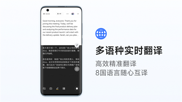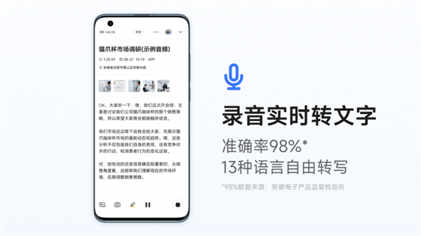 无论是办公会议、深度访谈,还是课堂记录,讯飞听见APP可在录音过程中实时转写24种语言(包括10国语言、12种方言和2种少数民族语言),中文转写准确率可达98%*。用户还可随时标记重点内容,用文字记录迸发的灵感,配合同频拍照,让记录更全面。(准确率98%结果由安徽电子产品监督检验所评测所得)