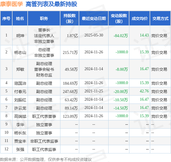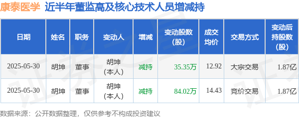 康泰医学近半年内的董监高及核心技术人员增减持详情如下: