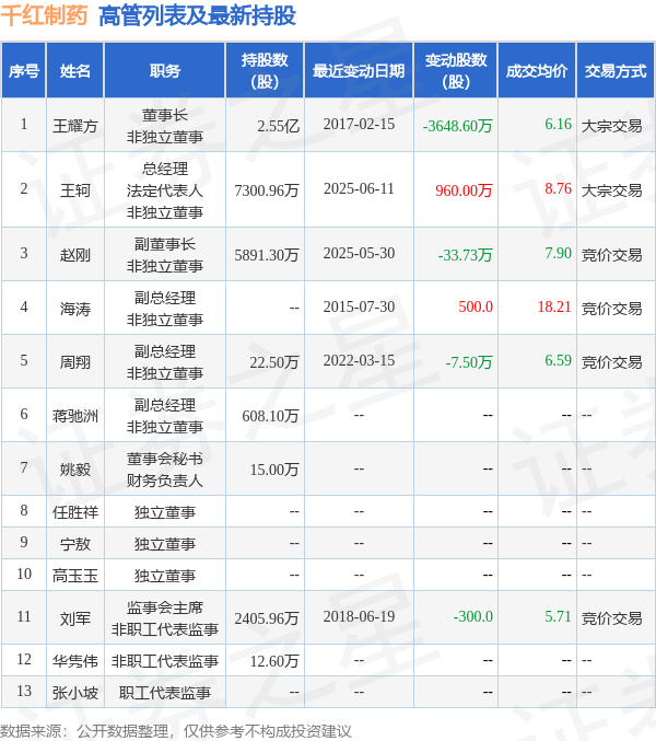 千红制药近半年内的董监高及核心技术人员增减持详情如下: