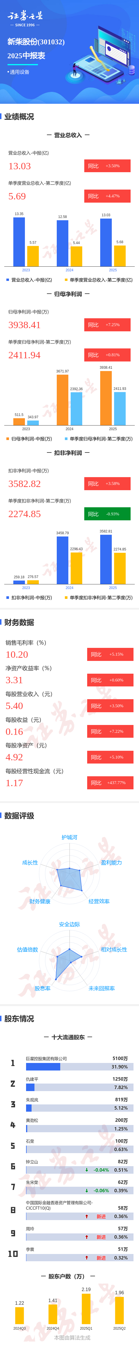 证券之星消息,新柴股份2025年中报显示,公司主营收入13.03亿元,同比上升3.51%;归母净利润3938.41万元,同比上升7.26%;扣非净利润3582.82万元,同比上升3.59%;其中2025年第二季度,公司单季度主营收入5.69亿元,同比上升4.47%;单季度归母净利润2411.94万元,同比上升0.82%;单季度扣非净利润2274.85万元,同比下降0.94%;负债率58.2%,投资收益111.98万元,财务费用-264.29万元,毛利率10.2%。