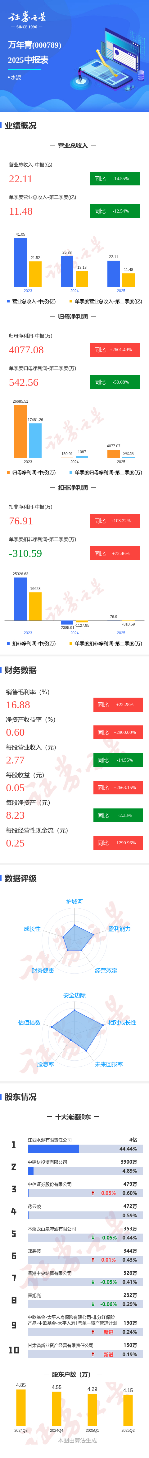 证券之星消息,万年青2025年中报显示,公司主营收入22.11亿元,同比下降14.56%;归母净利润4077.08万元,同比上升2601.49%;扣非净利润76.91万元,同比上升103.22%;其中2025年第二季度,公司单季度主营收入11.48亿元,同比下降12.54%;单季度归母净利润542.56万元,同比下降50.09%;单季度扣非净利润-310.59万元,同比上升72.46%;负债率36.06%,投资收益1733.72万元,财务费用1739.87万元,毛利率16.88%。
