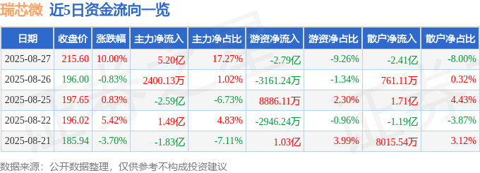 8月27日的资金流向数据方面,主力资金净流入5.2亿元,占总成交额17.27%,游资资金净流出2.79亿元,占总成交额9.26%,散户资金净流出2.41亿元,占总成交额8.0%。