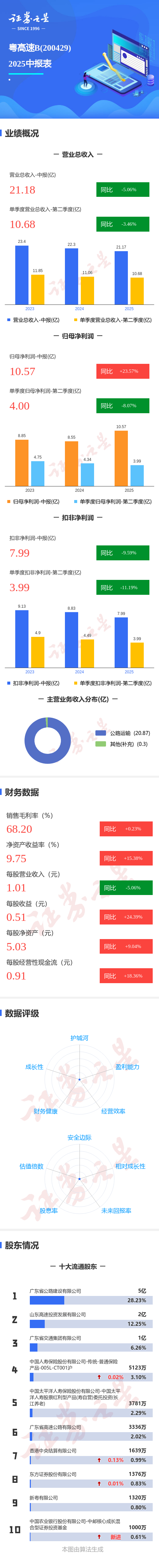 证券之星消息,粤高速B2025年中报显示,公司主营收入21.18亿元,同比下降5.06%;归母净利润10.57亿元,同比上升23.58%;扣非净利润7.99亿元,同比下降9.59%;其中2025年第二季度,公司单季度主营收入10.68亿元,同比下降3.47%;单季度归母净利润4.0亿元,同比下降8.07%;单季度扣非净利润3.99亿元,同比下降11.19%;负债率44.75%,投资收益1.43亿元,财务费用4368.42万元,毛利率68.2%。