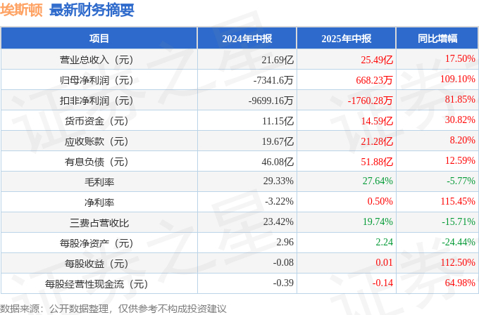 据证券之星公开数据整理,近期埃斯顿(002747)发布2025年中报。截至本报告期末,公司营业总收入25.49亿元,同比上升17.5%,归母净利润668.23万元,同比上升109.1%。按单季度数据看,第二季度营业总收入13.04亿元,同比上升11.87%,第二季度归母净利润-594.77万元,同比上升92.56%。本报告期埃斯顿公司应收账款体量较大,当期应收账款占最新年报营业总收入比达53.08%。