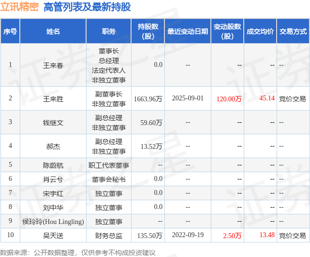 立讯精密的高管列表及最新持股情况如下: