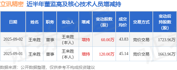证券之星消息,根据9月3日市场公开信息、上市公司公告及交易所披露数据整理,立讯精密(002475)最新董监高及相关人员股份变动情况:2025年9月2日公司董事王来胜共增持公司股份60.0万股,占公司总股本为0.0083%。变动期间公司股价下跌3.25%,9月2日当日收盘报43.8元。