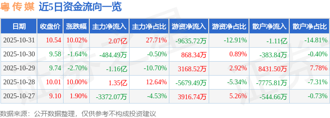 10月31日的资金流向数据方面,主力资金净流入2.07亿元,占总成交额27.71%,游资资金净流出9635.72万元,占总成交额12.91%,散户资金净流出1.11亿元,占总成交额14.81%。