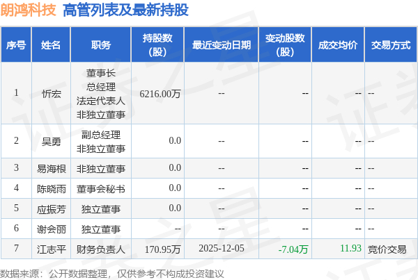 证券之星消息,根据12月13日市场公开信息、上市公司公告及交易所披露数据整理,朗鸿科技(920395)最新董监高及相关人员股份变动情况:2025年12月11日公司高级管理人员江志平共减持公司股份15.82万股,占公司总股本为0.1037%。变动期间公司股价上涨1.43%,12月11日当日收盘报12.03元。