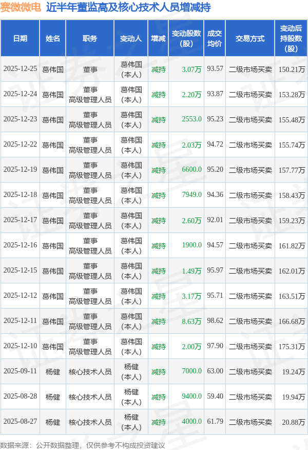 赛微微电近半年内的董监高及核心技术人员增减持详情如下:
