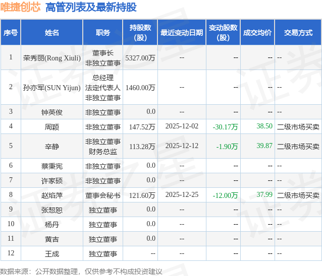 证券之星消息,根据12月26日市场公开信息、上市公司公告及交易所披露数据整理,唯捷创芯(688153)最新董监高及相关人员股份变动情况:2025年12月24日至2025年12月25日公司高级管理人员赵焰萍共减持公司股份19.78万股,占公司总股本为0.046%。变动期间公司股价上涨4.26%,12月25日当日收盘报38.21元。