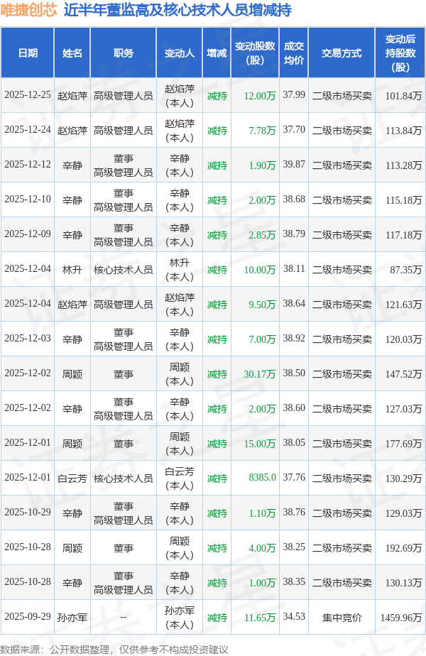 唯捷创芯近半年内的董监高及核心技术人员增减持详情如下: