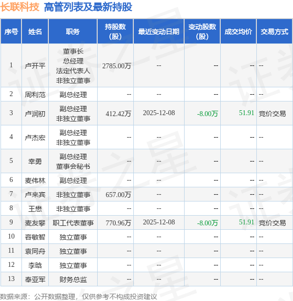 证券之星消息,根据12月26日市场公开信息、上市公司公告及交易所披露数据整理,长联科技(301618)最新董监高及相关人员股份变动情况:2025年12月25日公司董事,高管卢润初、董事麦友攀共减持公司股份26.06万股,占公司总股本为0.2889%。变动期间公司股价上涨0.35%,12月25日当日收盘报49.03元。