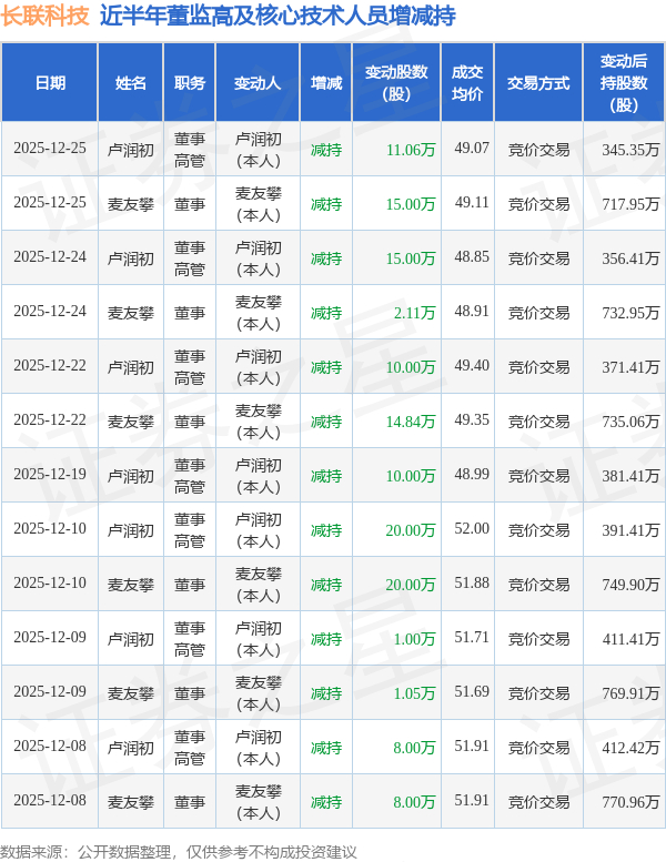 长联科技近半年内的董监高及核心技术人员增减持详情如下:
