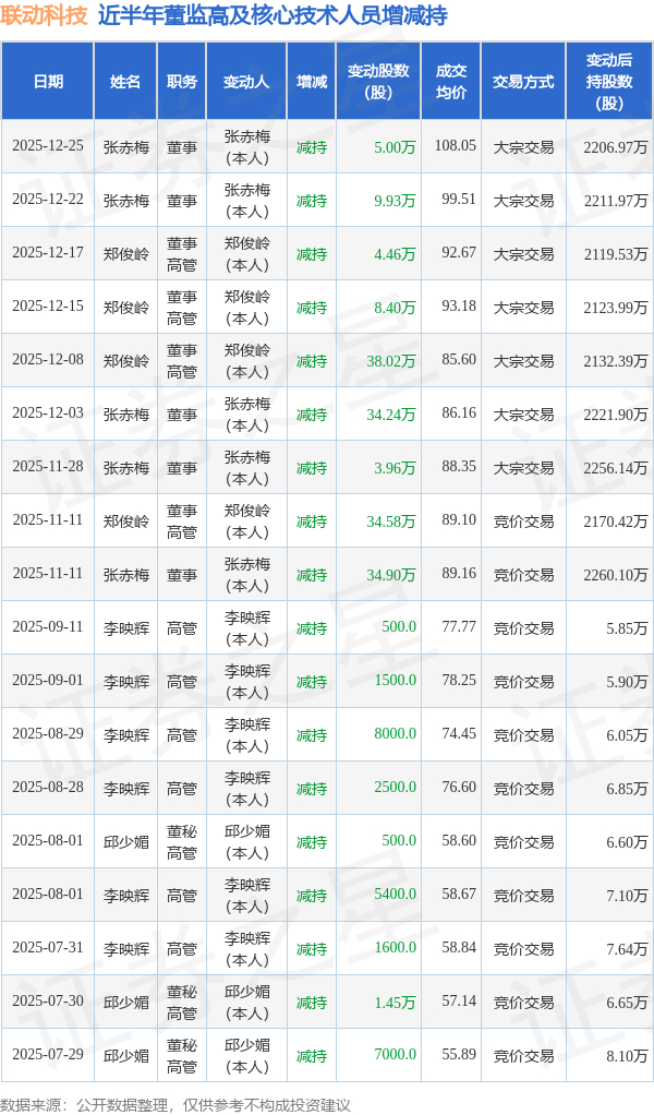 联动科技近半年内的董监高及核心技术人员增减持详情如下: