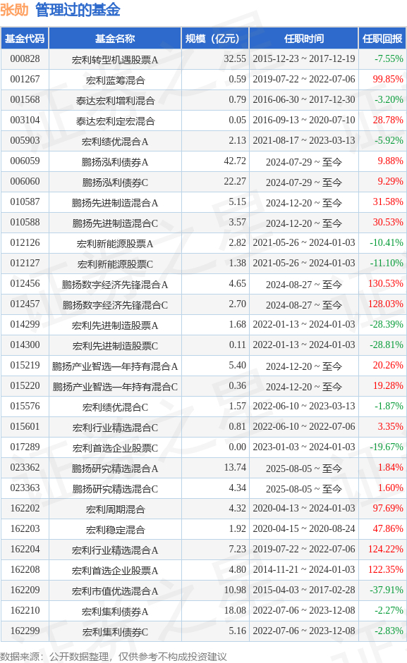 张勋先生:管理学硕士,研究部总监兼基金经理;总经理助理,2006年7月至2009年6月就职于天相投资顾问有限公司,担任研究组长;2009年7月至2010年4月就职于东兴证券股份有限责任公司,担任研究组长;2010年4月加入宏利基金管理有限公司,曾担任研究员、高级研究员,研究部副总监等,现任研究部总监兼任基金经理;具备基金从业资格。曾任宏利市值优选混合型证券投资基金、宏利转型机遇股票型证券投资基金、宏利增利灵活配置定期开放混合型证券投资基金、宏利定宏混合型证券投资基金、宏利首选企业股票型证券投资基金基金经理;2019年7月22日至2022年7月6日任宏利行业精选混合型证券投资基金基金经理、2019年7月22日至2022年7月6日任宏利蓝筹价值混合型证券投资基金基金经理。2020年4月13日起任宏利价值优化型周期类行业混合型证券投资基金基金经理。2021年5月26日至2024年1月3日担任宏利新能源股票型证券投资基金基金经理。2021年8月17日至2023年03月13日担任宏利绩优增长灵活配置混合型证券投资基金基金经理。2022年7月6日至2023年12月8日担任宏利集利债券型证券投资基金基金经理。2022年1月13日至2024年1月3日担任宏利先进制造股票型证券投资基金基金经理。曾任宏利价值优化型周期类行业混合型证券投资基金基金经理。2024年7月29日起担任鹏扬泓利债券型证券投资基金基金经理。2024年08月27日起任鹏扬数字经济先锋混合型证券投资基金基金经理。2024年12月20日起担任鹏扬先进制造混合型证券投资基金、鹏扬产业智选一年持有期混合型证券投资基金的基金经理。