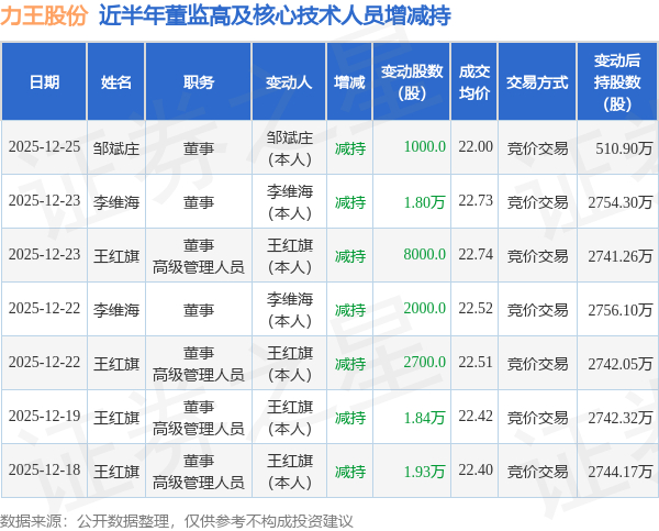 力王股份近半年内的董监高及核心技术人员增减持详情如下: