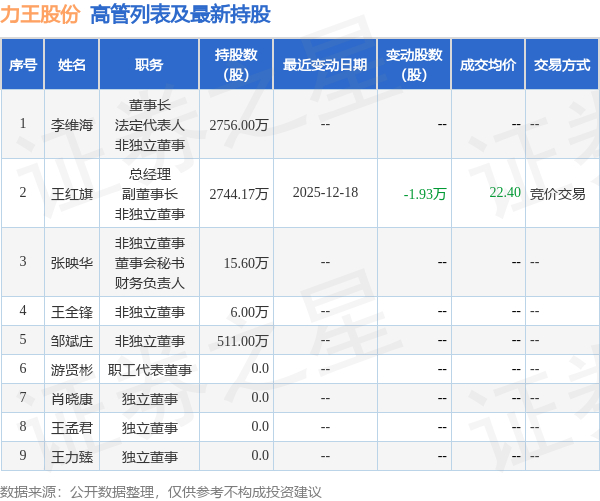力王股份的高管列表及最新持股情况如下: