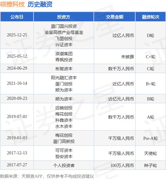 证券之星消息,根据天眼查APP于12月25日公布的信息整理,硕橙(厦门)科技有限公司D轮融资,融资额过亿人民币,参与投资的机构包括厦门国兴投资,渝富高质产业母基金,飞图创投,兴证资本。