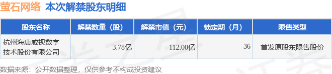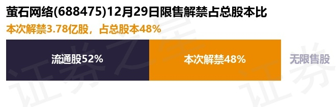 证券之星消息,根据市场公开信息整理,萤石网络(688475)于12月29日将有3.78亿股限售股份解禁,为公司首发原股东限售股份,占公司总股本48.0%。(本次数据根据历史公告整理得出,实际情况以上市公司最新公告为准)最近一年内,该股累计解禁472.5万股,占总股本的0.6%。本次解禁后,公司已无限售股份。具体如下图所示:
