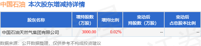 证券之星消息,12月29日中国石油发布公告《中国石油:中国石油天然气股份有限公司关于控股股东首次增持公司股份暨增持计划实施进展的公告》,其股东中国石油天然气集团有限公司于2025年4月8日至2025年12月29日间合计增持3000.0万股,占公司目前总股本的0.0164%,变动期间该股股价上涨37.06%,截止12月29日收盘报10.06元。