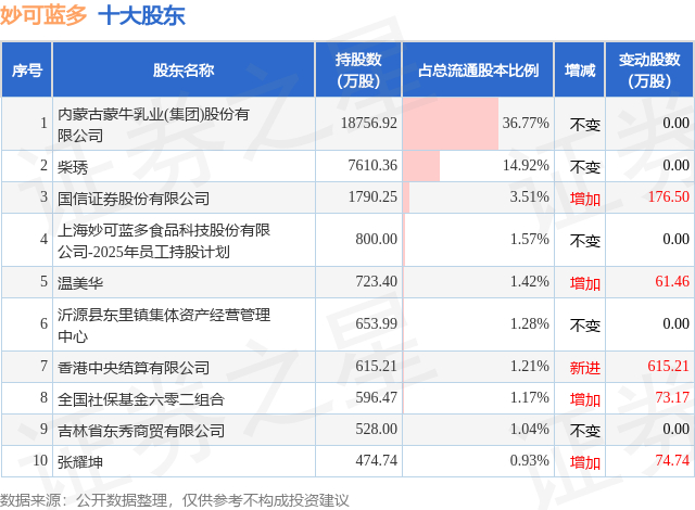 根据妙可蓝多2025年三季报公布的十大股东详情如下: