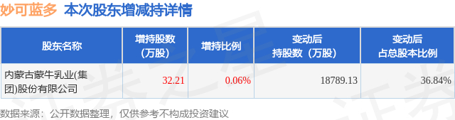 证券之星消息,12月29日妙可蓝多发布公告《妙可蓝多:关于控股股东增持公司股份及后续增持计划的公告》,其股东内蒙古蒙牛乳业(集团)股份有限公司于2025年12月29日合计增持32.21万股,占公司目前总股本的0.0632%,变动期间该股股价下跌9.28%,截止12月29日收盘报24.43元。