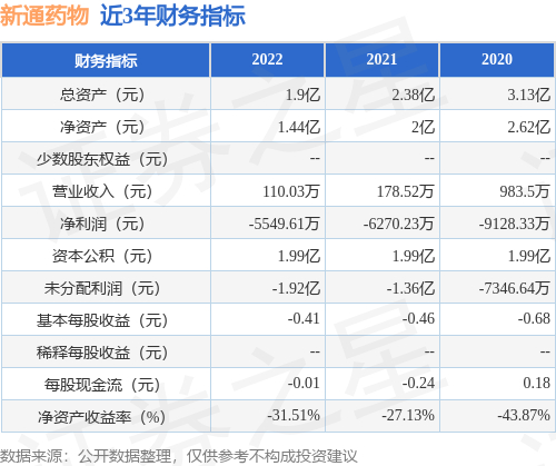 从目前公布的财报来看,新通药物2022年总资产为1.9亿元,净资产为1.44亿元;近3年净利润分别为-5549.61万元(2022年),-6270.23万元(2021年),-9128.33万元(2020年)。详情见下表: