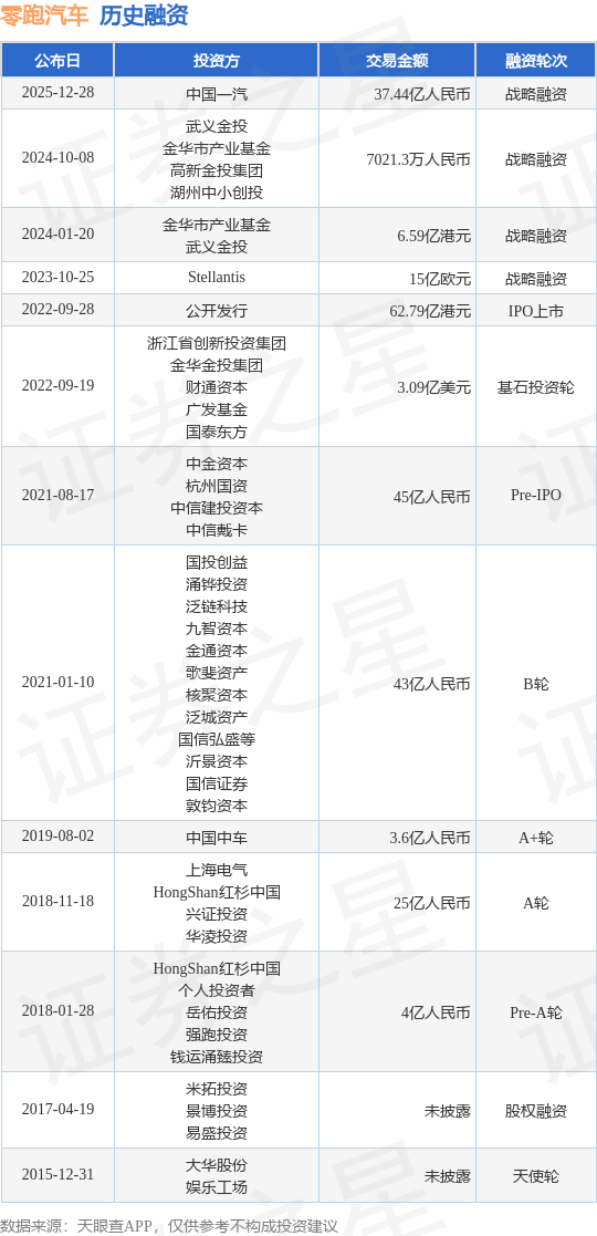 证券之星消息,根据天眼查APP于12月28日公布的信息整理,浙江零跑科技股份有限公司战略融资,融资额37.44亿人民币,参与投资的机构包括中国一汽。