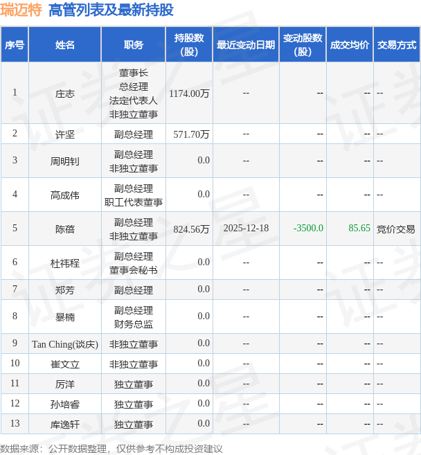 瑞迈特的高管列表及最新持股情况如下:
