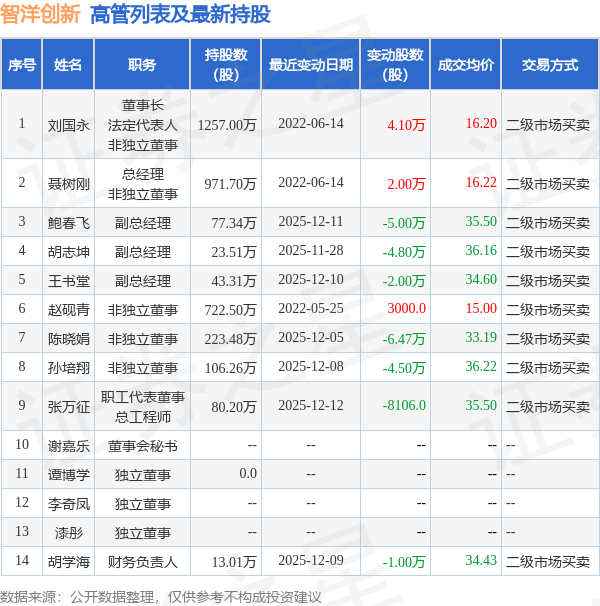 智洋创新的高管列表及最新持股情况如下:
