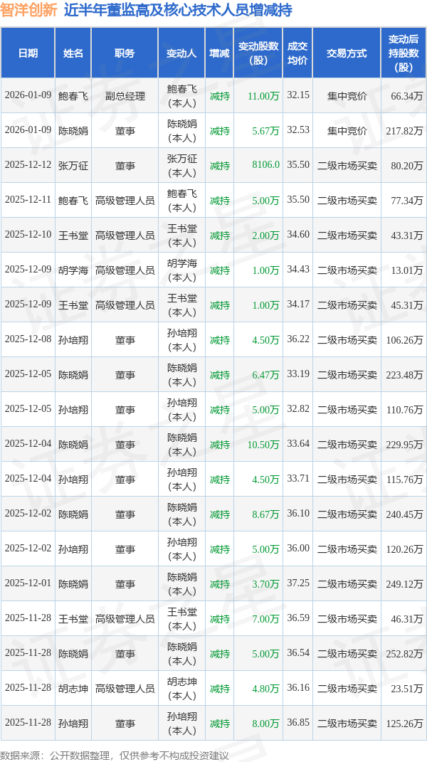 智洋创新近半年内的董监高及核心技术人员增减持详情如下: