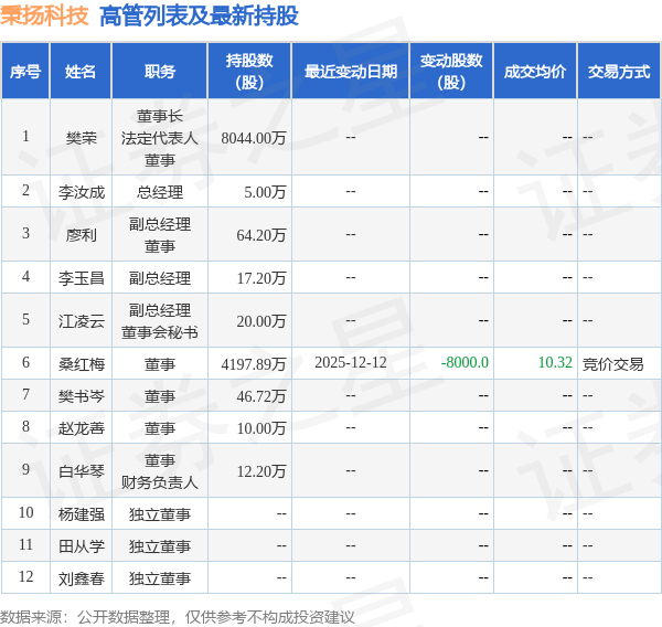 证券之星消息,根据1月10日市场公开信息、上市公司公告及交易所披露数据整理,秉扬科技(920675)最新董监高及相关人员股份变动情况:2026年1月9日公司董事樊书岑共减持公司股份1.99万股,占公司总股本为0.0116%。变动期间公司股价上涨0.19%,1月9日当日收盘报10.37元。