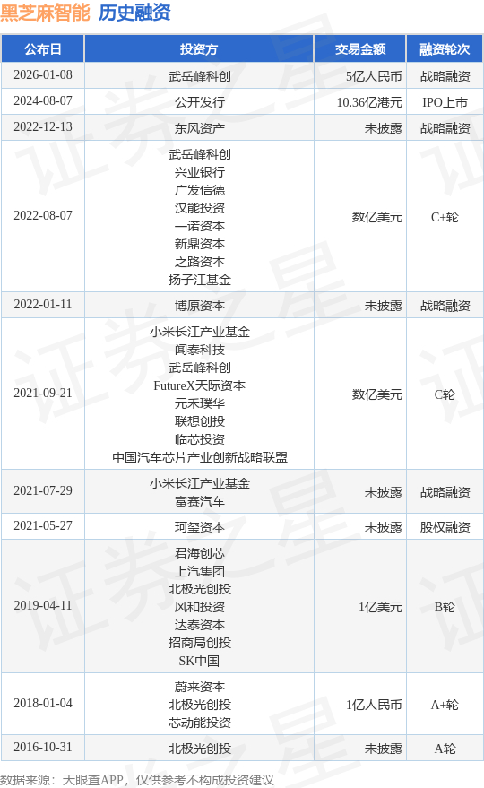 证券之星消息,根据天眼查APP于1月8日公布的信息整理,黑芝麻智能科技(上海)有限公司战略融资,融资额5亿人民币,参与投资的机构包括武岳峰科创。