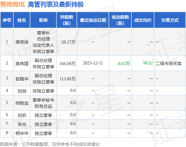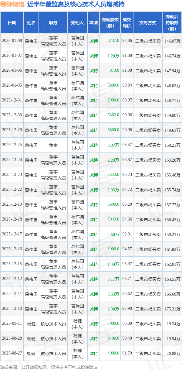 赛微微电近半年内的董监高及核心技术人员增减持详情如下:
