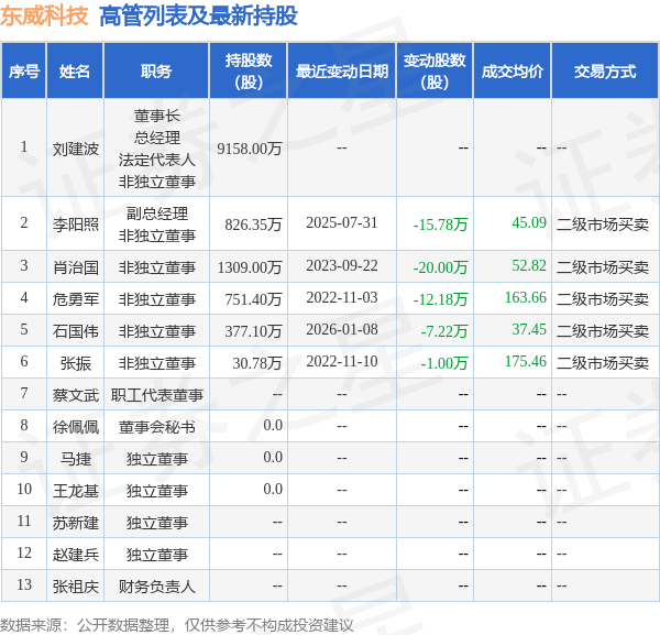 东威科技的高管列表及最新持股情况如下: