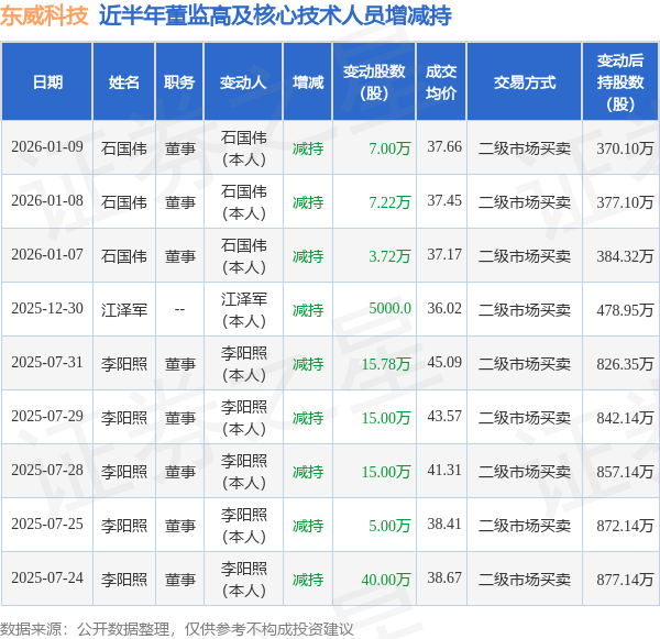 东威科技近半年内的董监高及核心技术人员增减持详情如下: