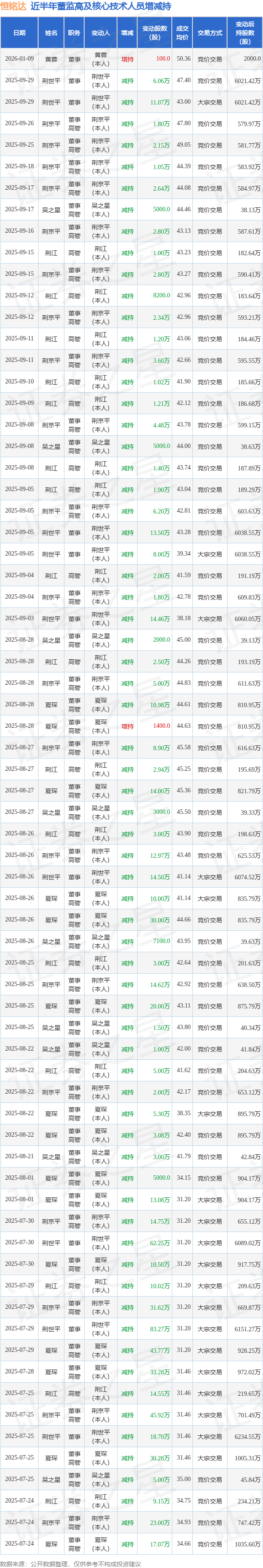 恒铭达近半年内的董监高及核心技术人员增减持详情如下: