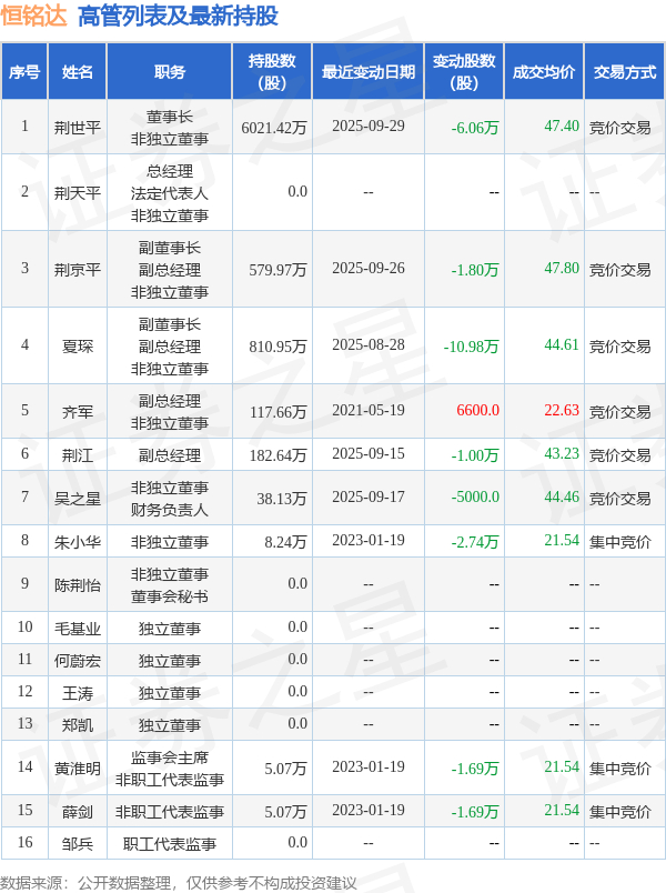 恒铭达的高管列表及最新持股情况如下: