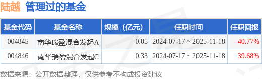 陆越女士:中国国籍,硕士研究生。曾任建信信托有限责任公司证券市场团队的投资经理助理,现任南华基金管理有限公司固定收益部的基金经理助理。2021年09月16日担任南华瑞利纯债债券型证券投资基金的基金经理助理。2021年12月31日任南华瑞扬纯债债券型证券投资基金基金经理助理。2022年02月16日任南华瑞泰39个月定期开放债券型证券投资基金基金经理助理。2022年07月06日担任南华瑞恒中短债债券型证券投资基金和南华瑞诚一年定期开放债券型发起式证券投资基金的基金经理助理。2022年7月19日担任南华丰淳混合型证券投资基金的基金经理助理。2022年8月16日担任南华瑞元定期开放债券型发起式证券投资基金、南华瑞鑫定期开放债券型发起式证券投资基金基金经理助理。2022年9月28日起任南华价值启航纯债债券型证券投资基金基金经理助理。2023年6月17日起任南华瑞富一年定期开放债券型发起式证券投资基金基金经理助理。2024年3月11日起任南华瑞享纯债债券型证券投资基金的基金经理助理。2024年4月12日起任南华中证同业存单AAA指数7天持有期证券投资基金基金经理助理。2024年07月17日至2025年11月18日任南华瑞盈混合型发起式证券投资基金基金经理。