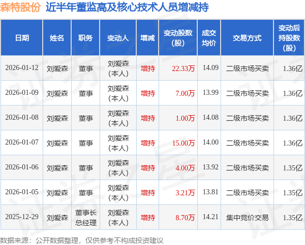 证券之星消息,根据1月13日市场公开信息、上市公司公告及交易所披露数据整理,森特股份(603098)最新董监高及相关人员股份变动情况:2026年1月9日至2026年1月12日公司董事刘爱森共增持公司股份29.33万股,占公司总股本为0.0544%。变动期间公司股价上涨1.42%,1月12日当日收盘报14.29元。