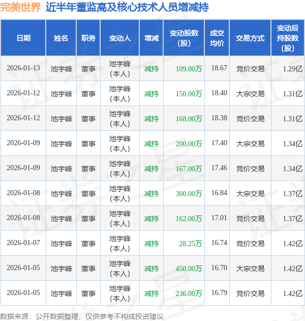 完美世界近半年内的董监高及核心技术人员增减持详情如下:
