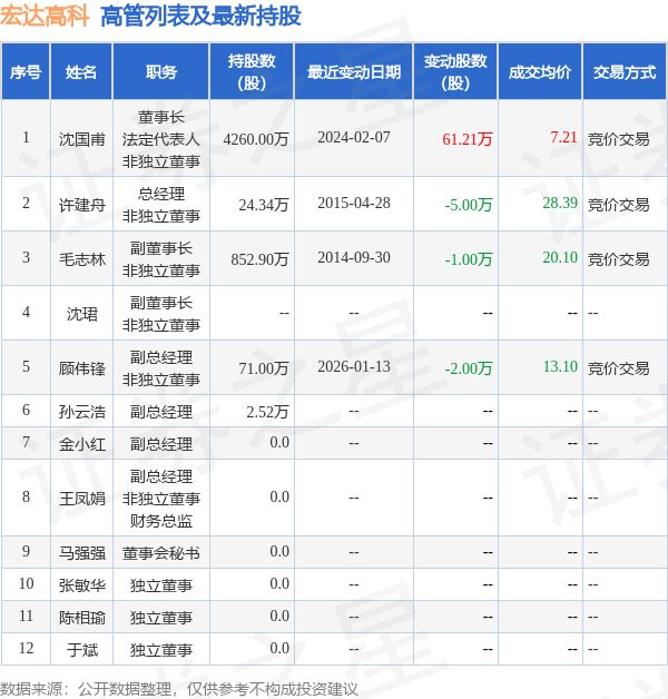 宏达高科近半年内的董监高及核心技术人员增减持详情如下: